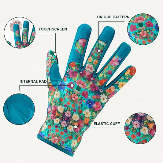 Women's Floral Gardening Gloves – Touchscreen Fingertips, Breathable Design, Non-Slip Leather Palm, One Size Fits Most