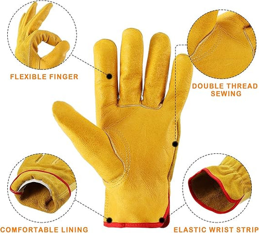 Heavy Duty Cowhide Leather Gardening Gloves – One Size Fits Most, Double-Thread Stitched, Flexible & Lined Work Gloves for Men and Women